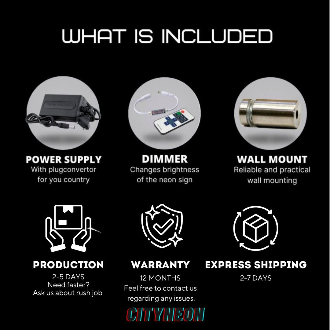 Neon Sign, 12V Power adapter (AC110-240V), Dimmer, Plug (depending on destination), and Wall Mount for easy installation.