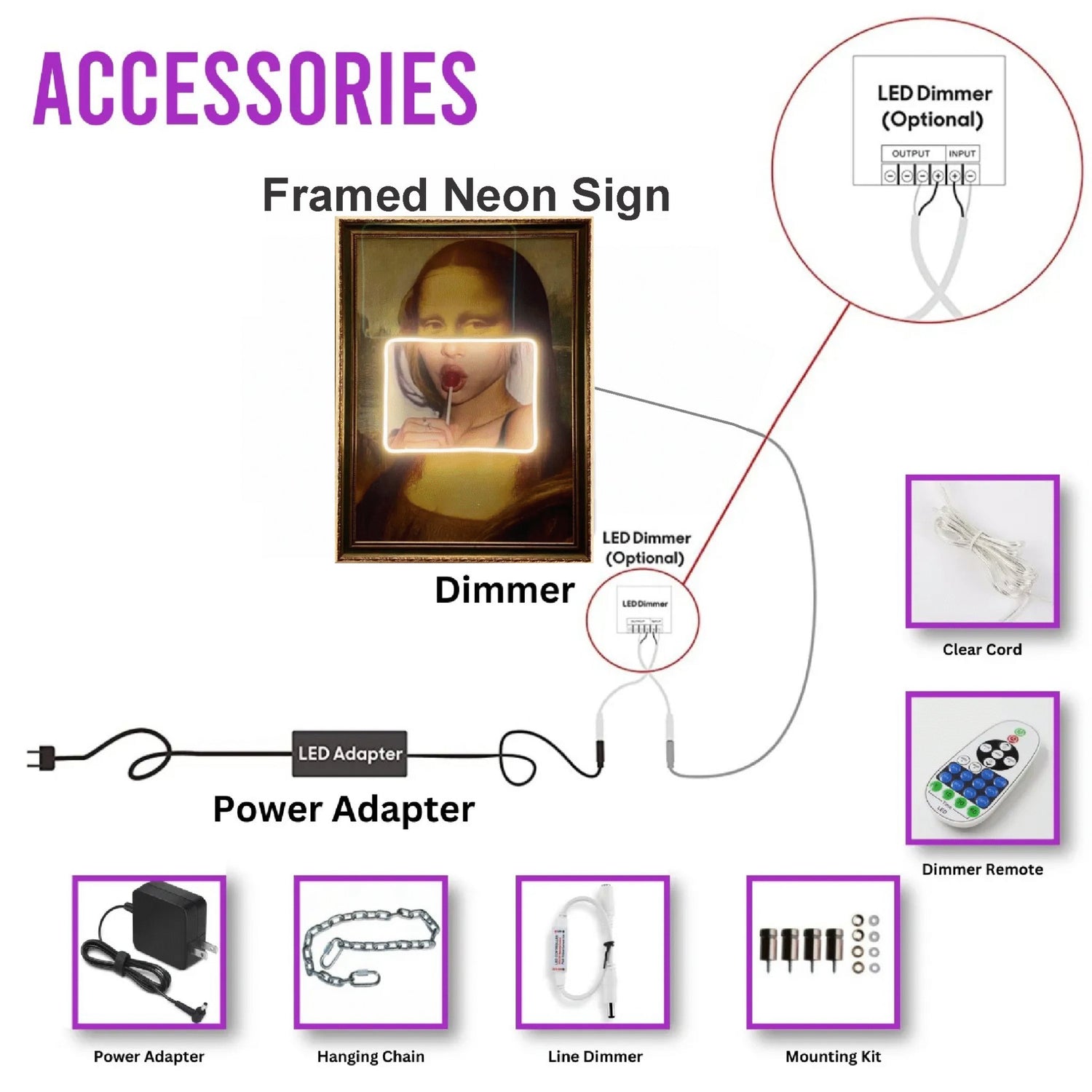 Neon Sign, 12V Power adapter (AC110-240V), Dimmer, Plug (depending on destination), and Wall Mount for easy installation.