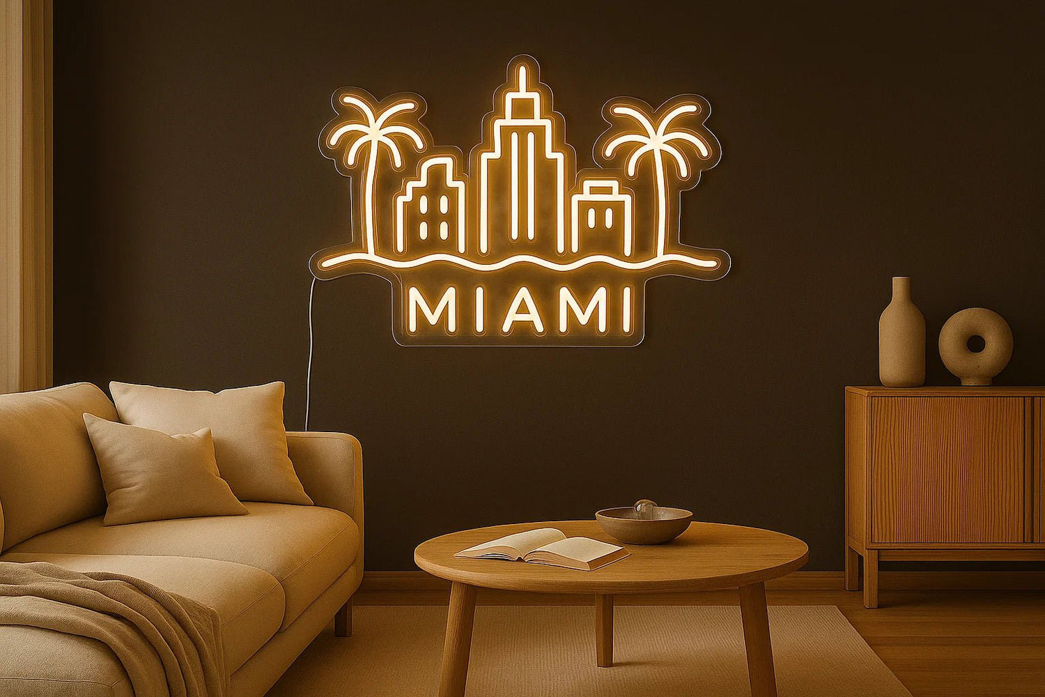 A minimal warm-white LED neon silhouette of the Miami skyline with subtle palm contours. Designed for modern interiors, beach-inspired spaces, studios, cafés, and home décor. The precision-cut acrylic backing shapes the skyline into a clean floating artwork. Lightweight and easy to install, available in three sizes.