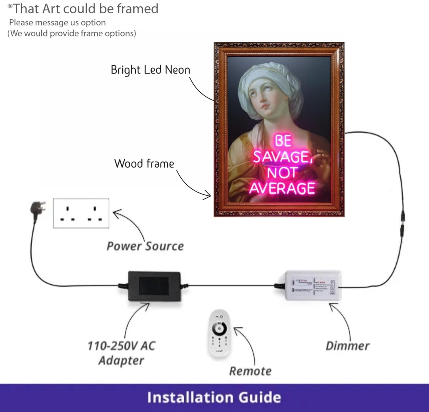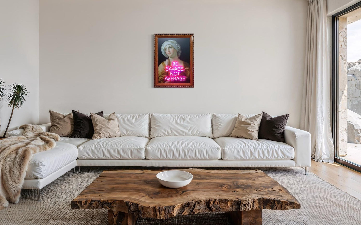 It's luxury neon wall art that blends vintage portrait art with bold modern energy. The pink neon sign features the inspiring quote “Be Savage, Not Average”, making it the perfect motivational sign for interiors that demand attention.