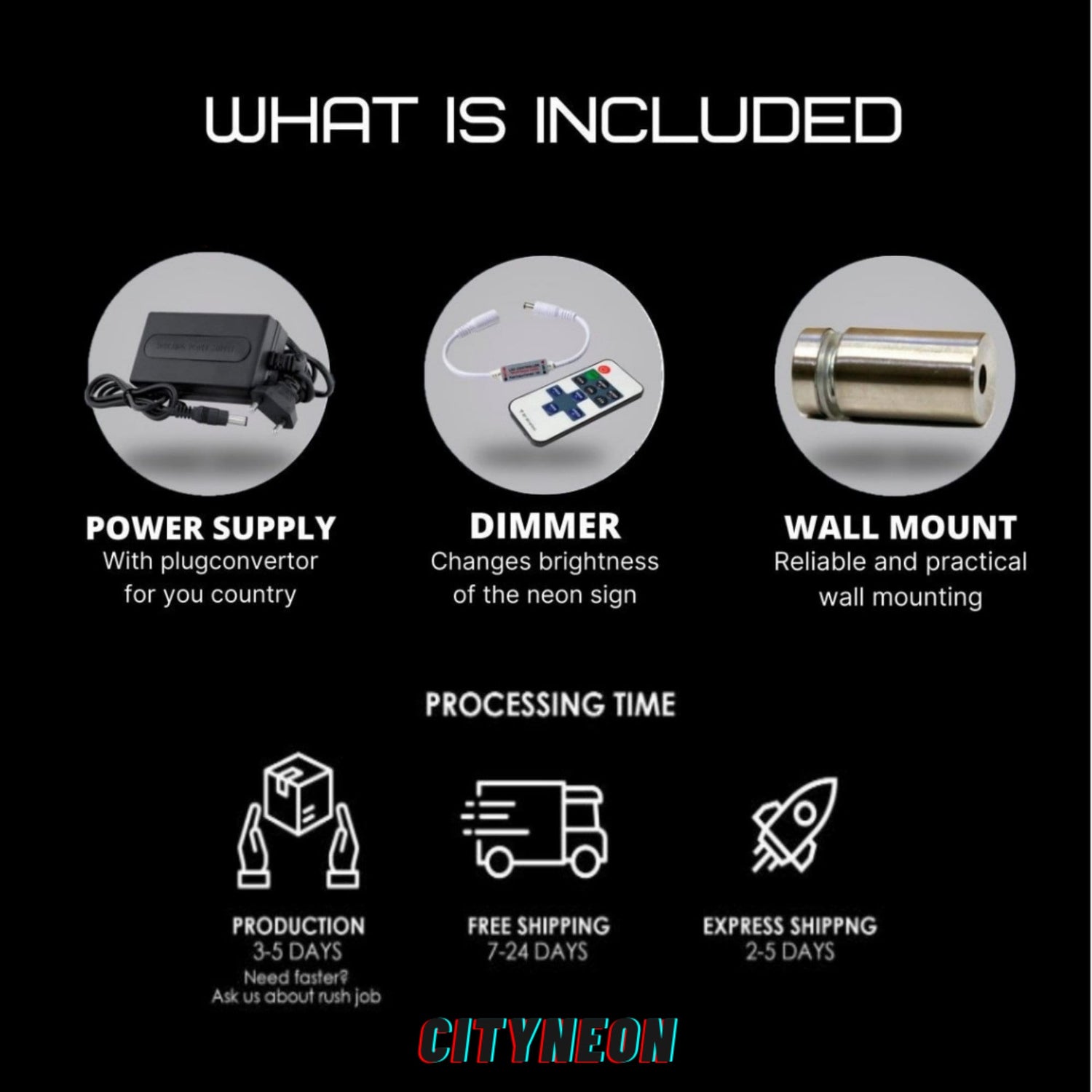 Neon Sign, 12V Power adapter (AC110-240V), Dimmer, Plug (depending on destination), and Wall Mount for easy installation.