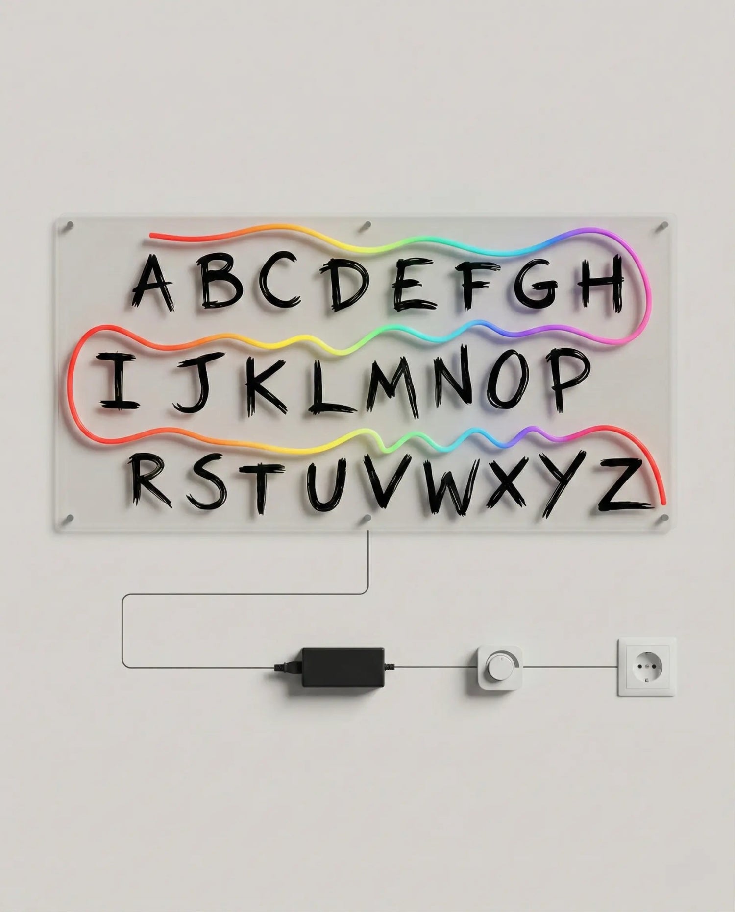 The artwork is mounted on clear acrylic, creating a clean floating effect on the wall. LED neon stays cool to the touch, runs silently, and provides an even, continuous glow. A dimmer is included, so you can easily adjust brightness — from a subtle background light to a bold visual centerpiece.
