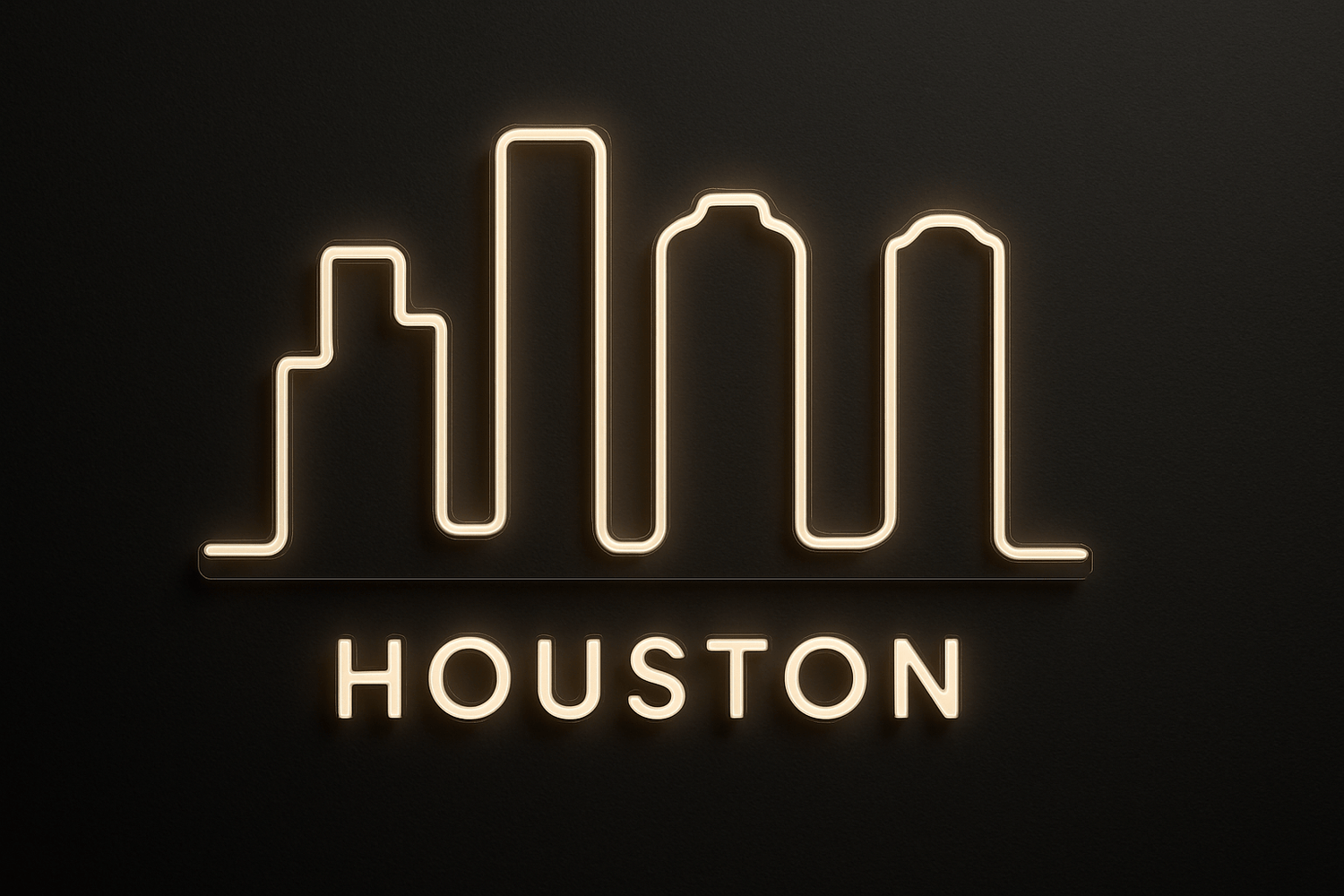 A soft warm-white continuous-line neon outline of the Houston skyline, designed for modern interiors. The acrylic backing follows the skyline form, creating a premium shadow-free floating look. Perfect for apartments, lounges, studios, and home offices.