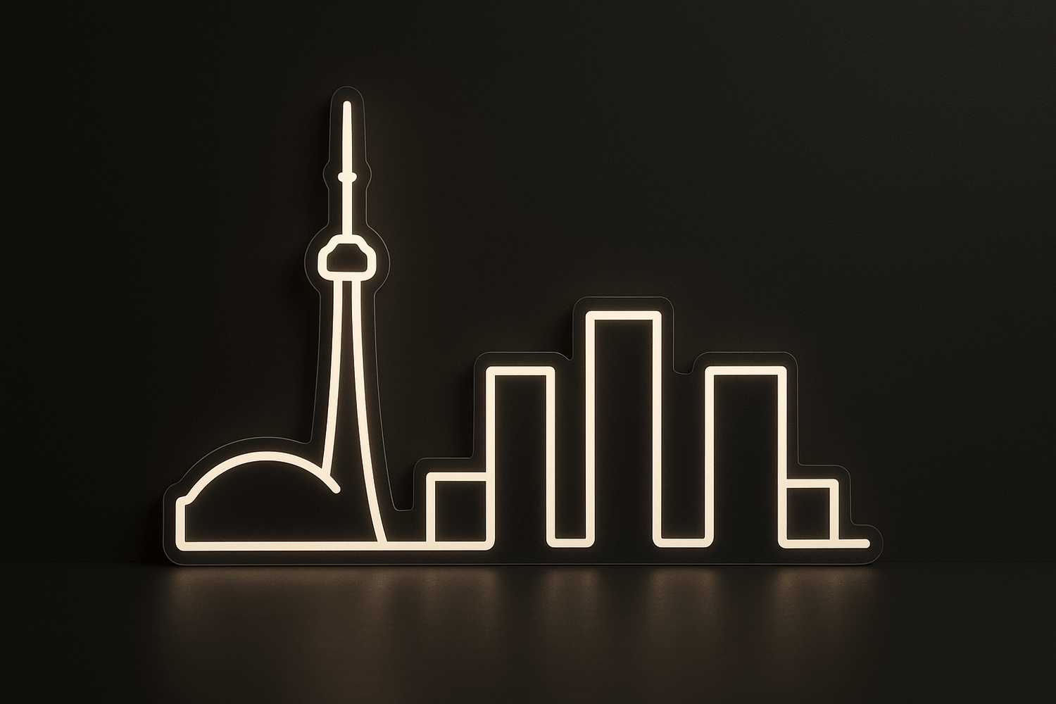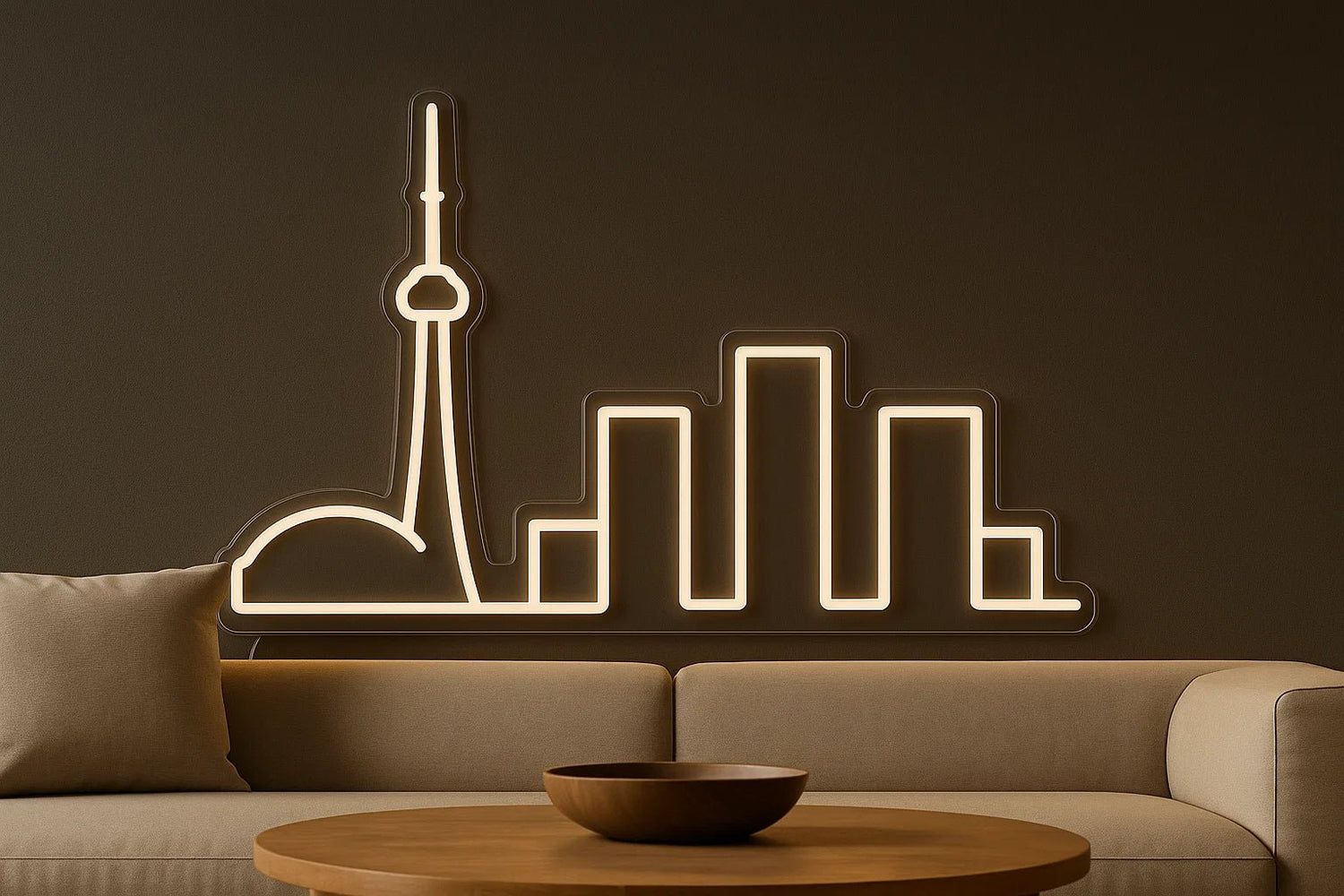 A minimal continuous-line warm-white LED silhouette of the Toronto skyline featuring the iconic CN Tower. Mounted on a precision-cut acrylic backing for a clean floating look, this piece enhances any modern interior with soft warm illumination.